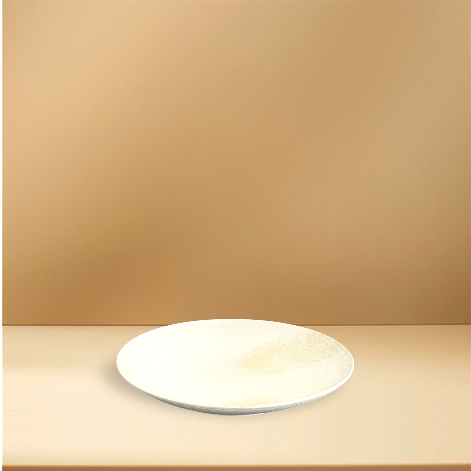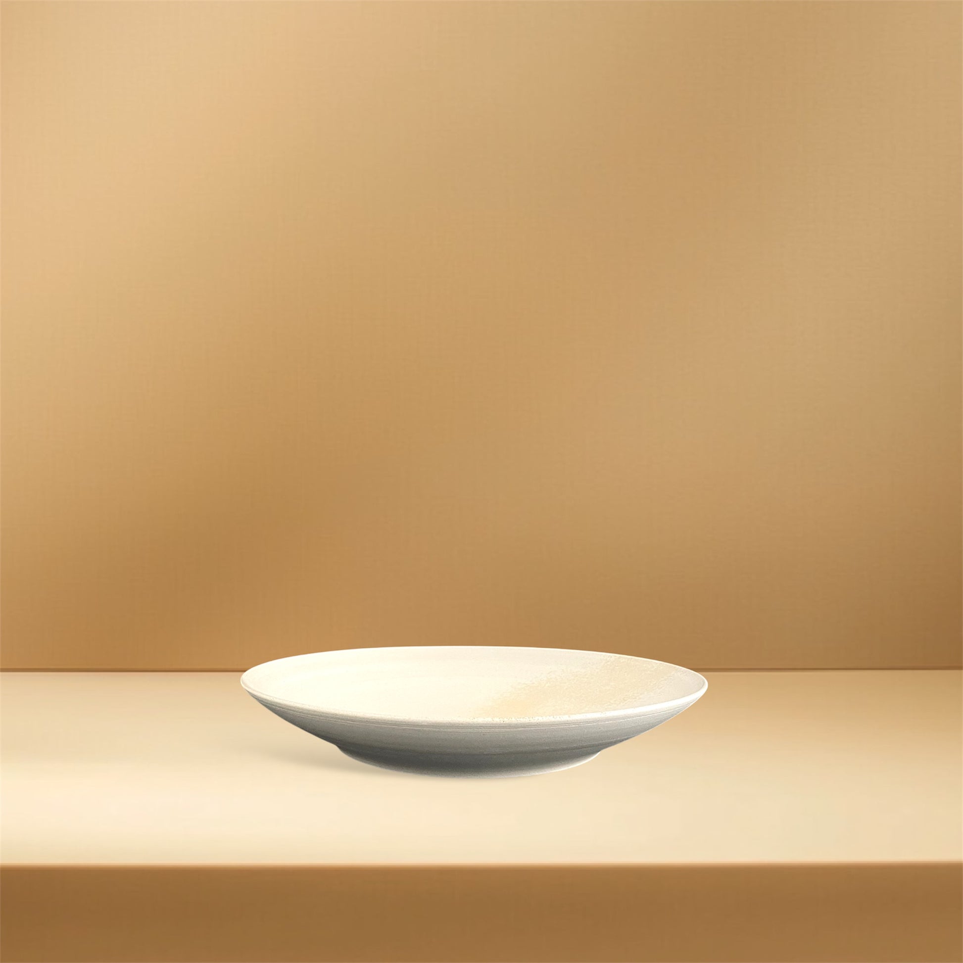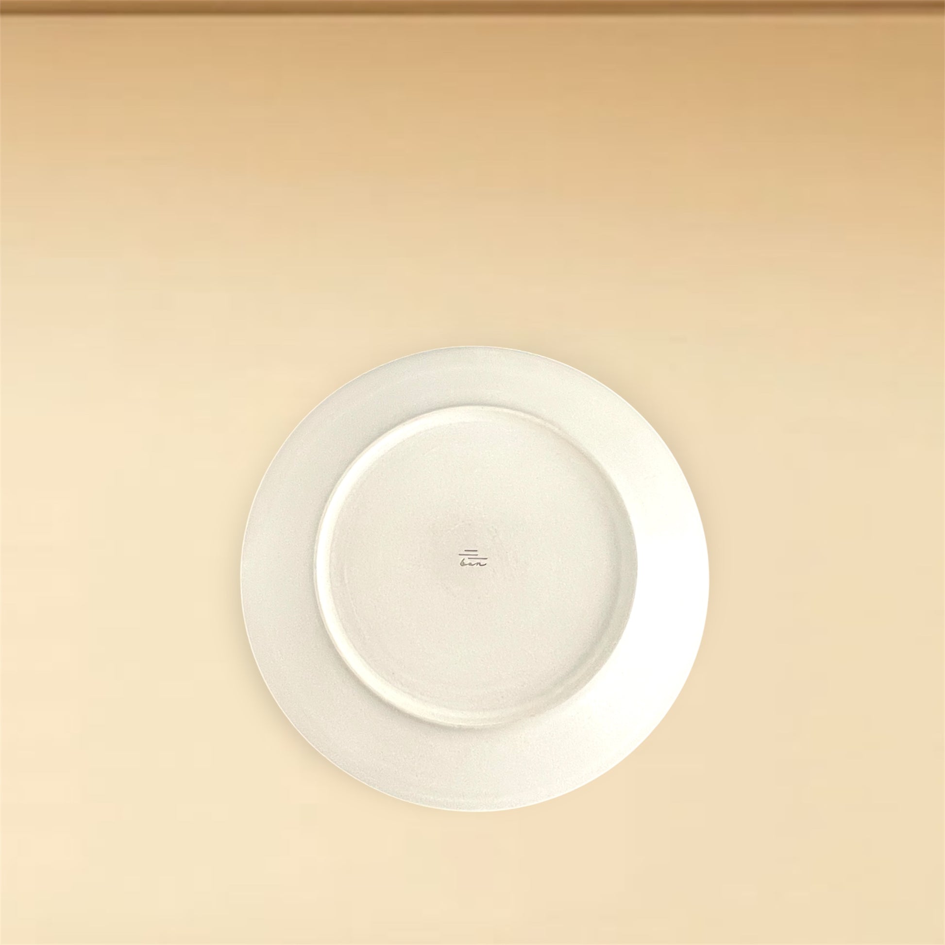 With its gentle curvature from rim to base, this round plate exemplifies understated elegance, resting gracefully on the table. Crafted in Tokoname, a region steeped in ceramic tradition, it is adorned with a soft matte finish and delicately scattered oyster shell powder—a distinctive detail drawn from the sea that surrounds its place of origin.
