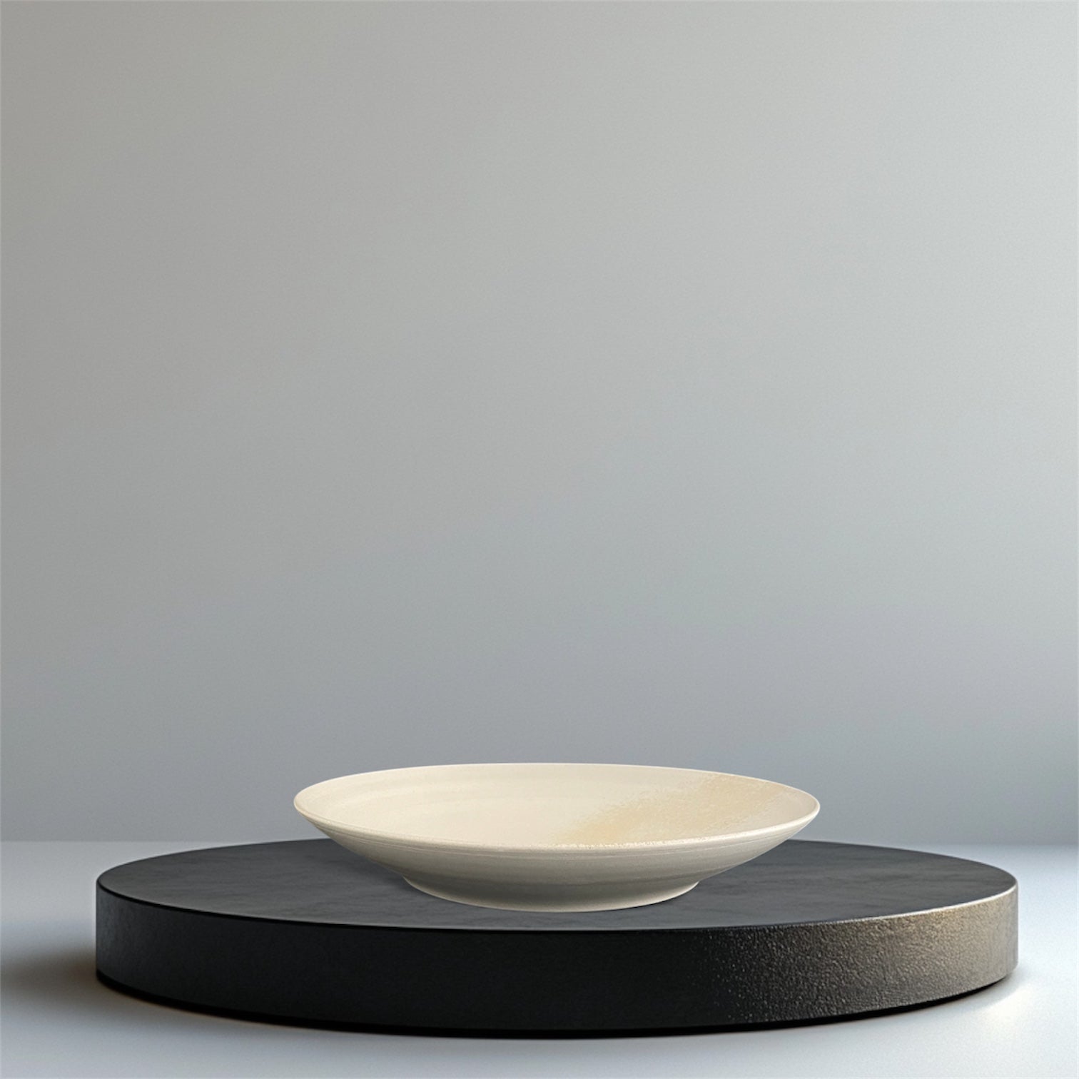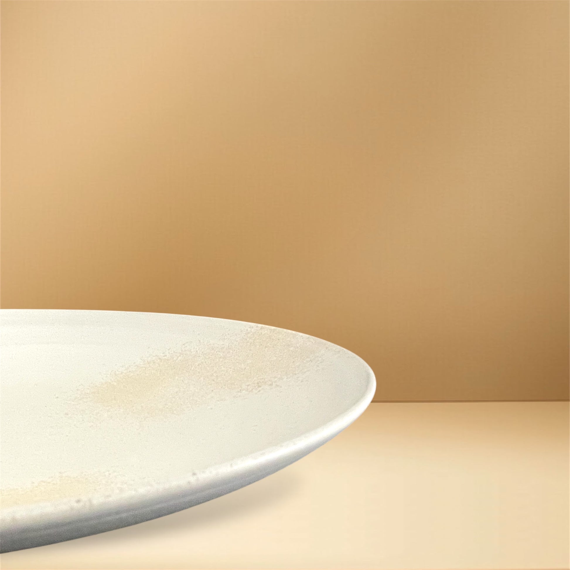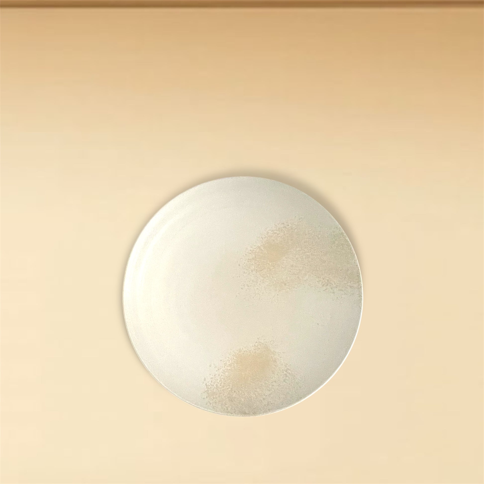 With its gentle curvature from rim to base, this round plate exemplifies understated elegance, resting gracefully on the table. Crafted in Tokoname, a region steeped in ceramic tradition, it is adorned with a soft matte finish and delicately scattered oyster shell powder—a distinctive detail drawn from the sea that surrounds its place of origin.